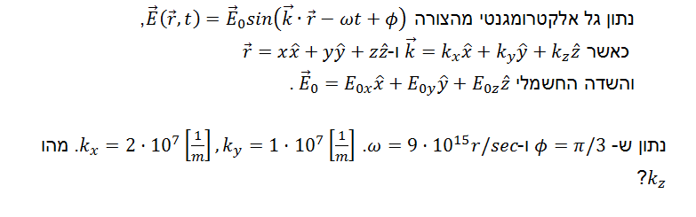 אשמח לקבל עזרה עם השאלות הבאות. א. נתון גל אלקטרומגנטי המתאר את כיוונו של שדה החשמלי: כאשר e ווקטור יחידה שלא ידוע. צריך להציע כיוון לשדה החשמלי. האם כל ווקטור שמאונך לכיוון של התקדמות הגל z (0.3,0.2,-0.1)/0.37 z יכול להתאים (ה-z רק בשביל היישור של הכתוב )? ב. מה ניתן להשתמש בשאלה הבאה כדי למצוא את הרכיב ב-z-י של כיוון התקדמות הגל ? ג. נתון גל אלקטרומגנטי המתאר את כיוונו של שדה החשמלי יש למצוא את השדה המגנטי, והתשובה היא: בחישוב אני מקבל אותה תשובה בלי ה-שורש 13, האם פיספתי משהו בחישוב ? ד. בהינתן ווקטור שטח S ווקטור פוינטינג, מהן שתי הנוסחאות שבאמצעותן וע"י שימוש בווקטורים האלו, ניתן לחשב את ההספק הכללי וההספק הממוצע במערכת? האם זה נכון: מכפלת ווקטור פוינטינג בשטח, נותנת הספק ? הערך הממוצע של ווקטור פוינטינג כפול השטח, נותן את ההספק ממוצע? תודה