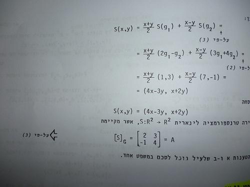 בוקר טוב לכולם , נתקלתי בשאלה הנ"ל ואני לא מצליח לפתור אותה .. אשמח להכוונה בדרך הפתרון . ( בכל מקרה כמובן לא להביא לי את הפתרון ) השאלה והפתרון שלי מצורפים .. אני ניסיתי להציב את הסקלרים בעמודה וזה נתן לי מטריצה עם שורת אפסים ובשורה זה נתן לי וקטור כללי שאני לא יכול להגדיר אותו בסיס .. http://up362.siz.co.il/img1/zivyqzniy3jz.jpg http://up361.siz.co.il/img1/g2yzx4ixjzwm.jpg