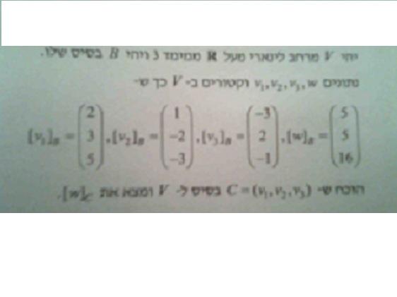 השאלה מצורפת דרך הפלאפון , אני מקווה שתבין אותה .. אני הצבתי את הוקטורים הנתונים כשורות ודירגתי כך שראיתי ששלושת v הינם בסיס , ואילו ה w הוא צ"ל שלהם . כמובן שאני לא רוצה שיפתרו לי אותה אלא יותר הכוונה לפתרון