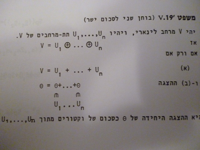 בוקר טוב לכולם , השאלה מצורפת , הפתרון אומר שהסכום אכן "סכום ישר " , אבל אני לא הבנתי מדוע .. את וקטור האפס הבנתי , אבל את השוואת המרחב לתת מרחבים - לא הבנתי . *הוספתי גם את התשובה *מדובר בסעיף ג