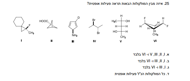 כן אבל בשאלה הראשונה שלי אני דיברתי על אחת שהיא מזו ואחת שהיא זהה לה ויש לה את אותה קונפיגורציה אבל אחרי סיבוב של מולקולת מזו .אז שניהם לא יהיו פעילות אופטית . עכשיו קיבלנו כאן אחת שהיא מזו ואחת שהיא לא איך אני יכולה להוכיח שהשנייה היא לא פעילה אופטית למרות שאין לה מישור שיקוף שמראה שהיא מזו כי היא לא מזו אלא אחרי סיבוב של מזו.. תודה