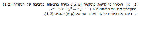 בא' אני צריכה קודם כול לכתוב את הפונקציה כ f(x,y,z)=0 ולמצוא את Z וכך אנחנו מוצאים שהנקודה ( 1,2,Z) (Z שאנחנו נמצא על ידי הצבה) . ואחר כך להגיד שלפונקציה יש נגזרות חלקיות רציפות כי היא פונקציה אלמנטרית. ואחר כך לגזור את הפונקציה לפי Z ולראות שהיא לא שווה ל 0 וכך אנחנו מוכיחים שפונקציה Z מוגדרת באופן יחיד. בב' אני יודעת שהפונקציה http://www.codecogs.com/gif.latex?e%5Ez=1-z+z%5E2/2+R2 עכשיו הפונקציה http://www.codecogs.com/gif.latex?f(x,y,z)%20=%20e%5Ez+2x+y%5E2-xy+z-5 ולכן פולינום טיילור יהיה: http://www.codecogs.com/gif.latex?1-z+z%5E2/2+2x+y%5E2-xy+z-5 וזה שווה : http://www.codecogs.com/gif.latex?1+z%5E2/2+2x+y%5E2-xy-5 ואני צריכה להציב (1,2) .... האם זה נכוון ?תודה רבהה