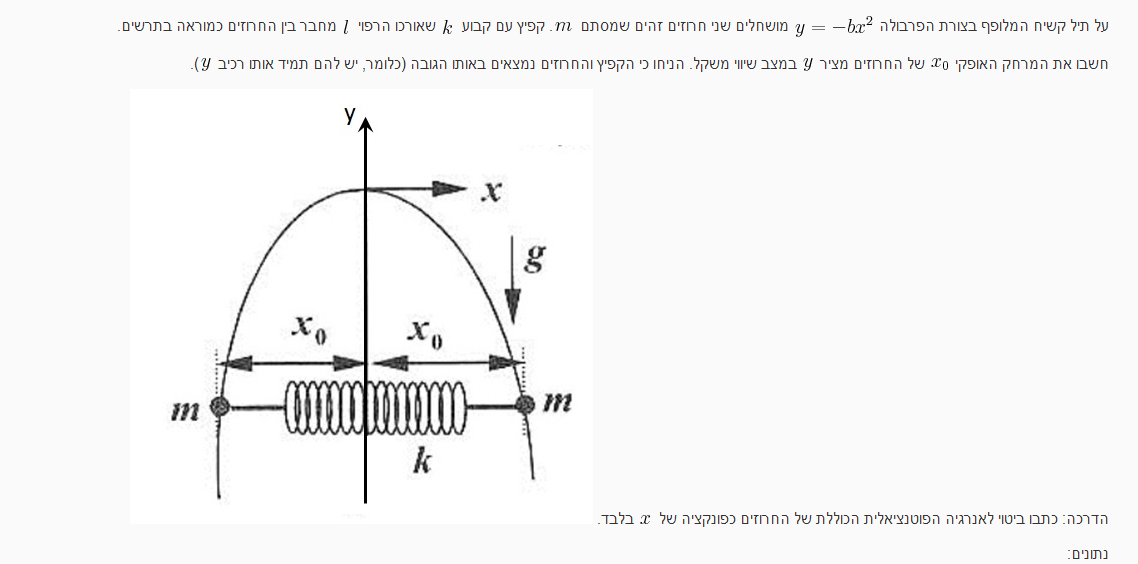 0.5k(2x-l)^2 אנרגיה אלסטית k(2x-l)*2=0 4kx-2kl=0 2x-l=0 2x=l x= l/2=2 האנרגיה הגרוויטציונית היא: mg(-bx^2)+mg(-bx^2) עכשיו מה אני עושה איתם?