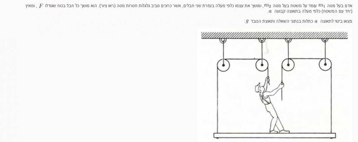 אני לא מבינה איך לרשום את תרשים הכוחות כאילו אני מבינה שהמשוואה הראשונה כנראה צריכה להיות : http://www.codecogs.com/gif.latex?F+m_%7B1%7Dg-T=%20m_%7B1%7Da אבל אני לא יודעת איך לבנות את השנייה עזרה בבקשה .. תודה ..