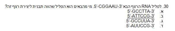 תודה רבה ... יש לי עוד שאלה בבקשה .. הקודונים בDNA שמקודדים לחומצה האמינית סרין הם: AGA, AGG, AGT, TCA, TCG ו-AGC. על גבי מולקולת tRNA המקודדת לחומצה האמינית סרין, נוכל למצוא את הרצף הבא: א. AGT ב. UGA ג. TCG ד. UCG
