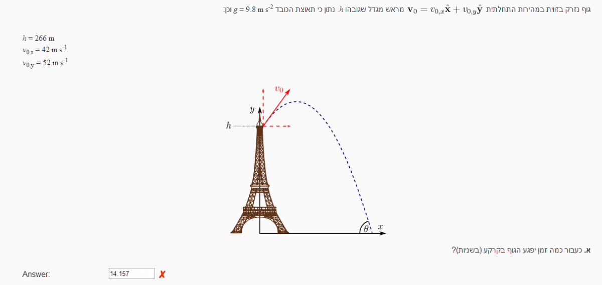 לא שכחתי אותו ..תראה המשוואה הייתה כך http://www.codecogs.com/gif.latex?266+52t-5t%5E2=0 אבל יוצא לי שזה לא נכון .. :(