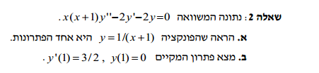 שאלה 3: ב' אני הגעתי בא' למשפחה: xy^2-x^3/3-x=c וב' 1 הגעתי ל xy^2-x^3/3=c איך אני עושה את 2 אני חשבתי שאני צריכה קודם כול למצוא את c במשפחה הראשונה וc משפחה שנייה ואז בעצם אני מקבלת עקומים ומשמם אני מקבלת את הישר x=1 אני מציבה באחד מהמשפחות ומקבלת y^2-1/3=c והשנייה y^2-1/3-1=c שאלה 4: אני לא מבינה איך לפתור? שאלה5: אני רואה שהאינטגרל הנ"ל אינו פתיר .. חשבתי על מד"ר פרידה אבל אני לא יודעת איך לפתור .. תודה