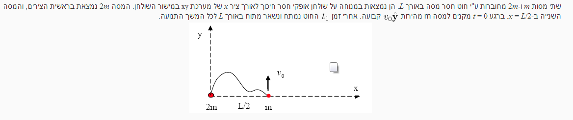 על מנת לחשב את המהירות הזוויתית כאן מה שעליי לעשות זה לפעול לפי הנוסחה הבאה: http://www.codecogs.com/gif.latex?J=w'I'%20+%20RcmMcmXVcm Vcm שלי כאן הוא v0/3 בכיוון Y ו RCM שלי בחרתי אותו להיות רגע לפני המתיחה כאשר t=0 והוא ימצא ב: L/6 בכיוון Y את מומנט ההתמד אני מחשבת כך:המסה הראשונה והיא m אני מחסירה L חלקי 2 מ L/6 ומקבלת L/3 והשנייה שהיא 2m אני פשוט מחסירה 0 מ L/6 ומקבלת L/6 ואז מציבה בנוסחה אבל זה לא יוצא נכון ... תודה ג. המהירות הזוויתית ω של שתי המסות סביב מרכז המסה שלהן אחרי המתיחה המקסימלית לאורך L היא: Choose one answer. a. http://phstudy.technion.ac.il/phmoodle/filter/tex/pix.php/260f8c5de6e23d1e82eb59e3ca2c6f93.gif נגד כיוון השעון b. http://phstudy.technion.ac.il/phmoodle/filter/tex/pix.php/fc6cb1fd8bbb18ce613b1ddd7b3d197f.gif נגד כיוון השעון c. http://phstudy.technion.ac.il/phmoodle/filter/tex/pix.php/260f8c5de6e23d1e82eb59e3ca2c6f93.gif עם כיוון השעון d. http://phstudy.technion.ac.il/phmoodle/filter/tex/pix.php/fc6cb1fd8bbb18ce613b1ddd7b3d197f.gif עם כיוון השעון Question15Points: 1ד. האנרגיה שאבדה בתהליך מתיחת החוט היא: Choose one answer. a. http://phstudy.technion.ac.il/phmoodle/filter/tex/pix.php/47ebf315c6554199de193726db18b04c.gif b. http://phstudy.technion.ac.il/phmoodle/filter/tex/pix.php/4e8dae794459e8a2935321edd2b21bc4.gif c. http://phstudy.technion.ac.il/phmoodle/filter/tex/pix.php/896c6eae5984f303fb8f07ab70bc028e.gif d. http://phstudy.technion.ac.il/phmoodle/filter/tex/pix.php/2695cfc1e2812fcbbc532fd0e64856c8.gif