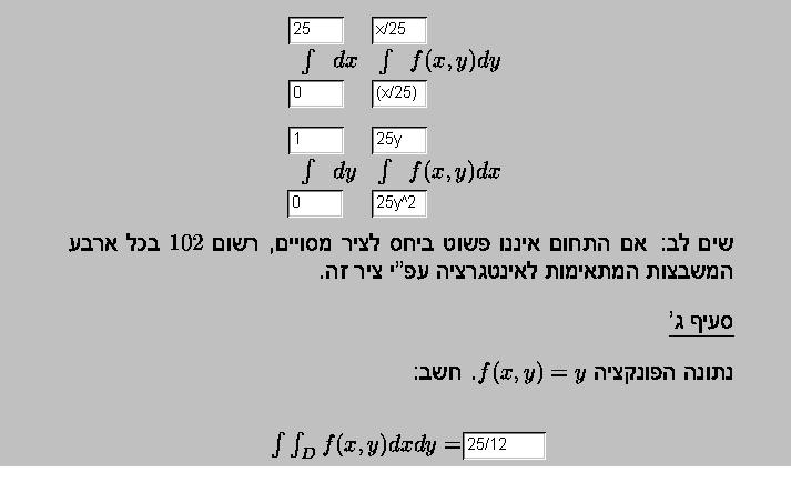 עדיין יוצא שיש טעות קיבלתי 80% ולפי זה היה 50% .. הייתי גם צריכה לשנות את התשובה של הסעיף האחרון ושיניתי את גבולות האנטגרציה 25y^2 ו 25y ..