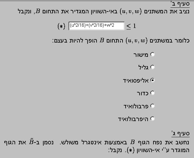 אותו תרגיל שמקודם.. ואני מתקנת יצא לי שהתשובה הסופית נכונה אבל הציון 80% יש לי טעות בהצבת האנטגרנד .. אני לא מבינה מה אני צריכה להציב שם .. אני השתמשתי בקוארדינטות פולריות ... האם אני צריכה למצוא את היקוביאן ל u ו v ואז ולמצוא את האנטגרל כי זה לא יוצא לי נכון ... תודה