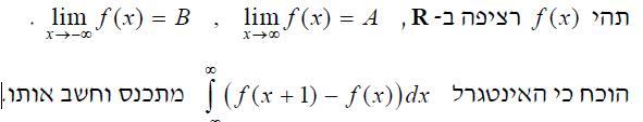 8. היי, אשמח לקצת עזרה עם השאלה. (מצורפת תמונה) אני מבין שהפונקציה שואפת לאפס באינסוף ובמינוס אינסוף. תכננתי לחלקאת הישר ל-3 קטעים: קטע סגור באמצע שעבורו ההתכנסות היא טריוויאלית ועוד שני קטעים חצי סגורים. הבעיה היא שאני לא מצליח להחיל על הקטעים האינסופיים שום מבחן התכנסות.