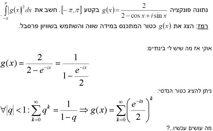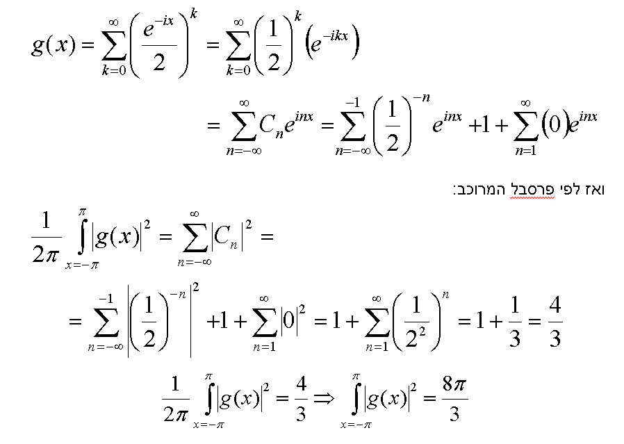 2. אוקיי תודה על התשובה! רק יש לי בעיה, המינוס בחזקה של ה e לא מפריע לי להגיע להצגה של מקדם בטור פוריה מרוכב? אני רוצה ביטוי בצורה של e בגובה inx+.
