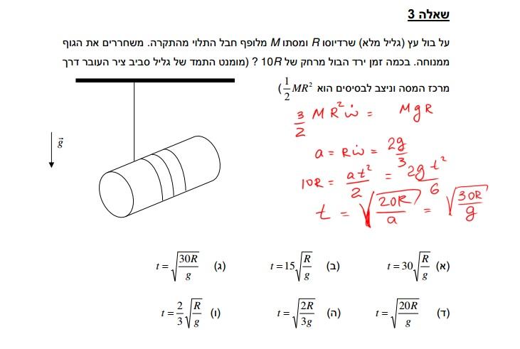 בשאלה הזאת, החוט מתנהג כמו חיכוך שגורם לגלגול והכוח השני הוא כבידה שהוא מרכזי אז אני בעקרון כן יכול להשתמש בשימור אנרגיה. למה אבל ספציפית בשאלה הזאת השימור לא עובד? אם אני מגדיר גובה התחלתי בתור 10R ומשווה לאנרגיה הקינטית כאשר הגובה מגיע במערכת הצירים שקבעתי ל- 0 + האנרגיה הקינטית (סיבוב ותנועה). אחרי זה מוצא את המהירות ובעזרת משוואת המהירות v(t)=v0-gt zzz מוצא את הזמן שכמובן יוצא לא נכון. עכשיו או שטעיתי בזה שהשתמשתי ב- g בתור תאוצת הנפילה כי החוט מפעיל כוח או שאי אפשר לעשות פה שימור אנרגיה מסיבה שלא ממש הבנתי. מה שבטוח שהדרך שלי לא נכונה.