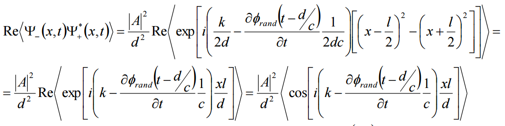 אני צריך לחשב את תבנית ההתאבכות של שני מקורות אור נקודתיים הממוקמים במרחק l זה מזה על פני מדך במרחק d המוצב במקביל לקו המחבר בין שני המקורות, המקיים http://www.codecogs.com/gif.latex?d%5Cgg%20%5Cleft%20%7C%20x%5Cpm%5Cfrac%7Bl%7D%7B2%7D%20%5Cright%20%7C. פוקנצית הגל של המקורות: http://www.codecogs.com/gif.latex?%5Cpsi(%5Cvec%20r,%20t)=%5Cfrac%7BA%7D%7Br%7D%5Cexp%5Bi(kr-%5Comega%20t-%20%5Cphi_%7Brand%7D(t-%5Cfrac%7Br%7D%7Bc%7D))%5D phi rand זהה עבור שני המקורות. פיתוח של r לטור טיילור נותן: http://www.codecogs.com/gif.latex?r%5Ccong%20d+%5Cfrac%7B%5Cleft%20(x%5Cpm%5Cfrac%7Bl%7D%7B2%7D%20%5Cright%20)%5E2%7D%7B2d%7D ובהתאם ל- phi: http://www.codecogs.com/gif.latex?%5Cphi%5Cleft%20(%20t-%5Cfrac%7Br%7D%7Bc%7D%20%5Cright%20)%5Ccong%5Cphi%5Cleft%20(%20t-%5Cfrac%7Bd%7D%7Bc%7D%20-%5Cfrac%7B%5Cleft%20(%20x%5Cpm%5Cfrac%7Bl%7D%7B2%7D%20%5Cright%20)%7D%7B2dc%7D%5Cright%20)%5Ccong%5Cphi%5Cleft%20(%20t-%5Cfrac%7Bd%7D%7Bc%7D%20%5Cright%20)-%5Cfrac%7B%5Cpartial%20%5Cphi%20%5Cleft%20(%20t-%5Cfrac%7Bd%7D%7Bc%7D%20%5Cright%20)%7D%7B%5Cpartial%20t%7D%5Cfrac%7B%5Cleft%20(%20x%5Cpm%5Cfrac%7Bl%7D%7B2%7D%20%5Cright%20)%5E2%7D%7B2%20d%20c%7D ה"נוסחה" לעוצמה: http://www.codecogs.com/gif.latex?I(x,t)=%5Cleft%20%5Clangle%20%5Cleft%20%7C%5Cpsi_%7B-%7D%20%5Cright%20%7C%5E2%20%5Cright%20%5Crangle+%5Cleft%20%5Clangle%20%5Cleft%20%7C%5Cpsi_%7B+%7D%20%5Cright%20%7C%5E2%20%5Cright%20%5Crangle+2Re%5Cleft%20%5Clangle%20%5Cpsi_%7B-%7D%5Cpsi%5E*_%7B+%7D%20%5Cright%20%5Crangle ועכשיו, אני לא מבין את הפיתוח לביטוי המעורב. אשמח לעזרה שם (תמונה).