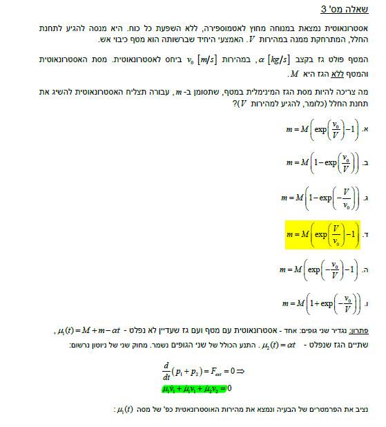 שלום לכולם, אשמח לעזרה בשאלה הבאה: ניסיתי לפתור כך: http://www.codecogs.com/gif.latex?m(t)=m_%7B0%7D%20-%20%5Calpha%20t http://www.codecogs.com/gif.latex?v(t=0)=v_%7B0%7D http://www.codecogs.com/gif.latex?F_%7Bf%7D=-%20%5Cmu%20N http://www.codecogs.com/gif.latex?N(t)=(m_%7B0%7D-%20%5Calpha%20t)g http://www.codecogs.com/gif.latex?v(t)=? נסמן: P1-תנע המזחלת שלא נמסה(עדיין) P2- תנע חלק המסה שנמס http://www.codecogs.com/gif.latex?P_%7B1%7D=m(t)v_%7B1%7D(t) http://www.codecogs.com/gif.latex?P_%7B2%7D=(dm)v_%7B2%7D=const. שימור תנע: http://www.codecogs.com/gif.latex?%5CSigma%20F_%7Btot%7D%20=%20%5Cdot%7BP%7D%20_%7Btot%7D http://www.codecogs.com/gif.latex?F_%7Bf%7D=-%5Cmu(m_%7B0%7D%20-%20%5Calpha%20t)g=%5Cdot%7BP%7D_%7B1%7D+%5Cdot%7BP%7D_%7B2%7D=%5Cdot%7Bm%7D(t)v_%7B1%7D(t)+m(t)%5Cdot%7Bv%7D_%7B1%7D(t) http://www.codecogs.com/gif.latex?-%5Cmu(m_%7B0%7D%20-%20%5Calpha%20t)g=-%5Calpha%20v_%7B1%7D(t)+(m_%7B0%7D%20-%20%5Calpha%20t)%5Cdot%7Bv%7D_%7B1%7D(t) http://www.codecogs.com/gif.latex?%5Cdot%7Bv%7D_%7B1%7D(t)-%20%5Cfrac%7B%5Calpha%7D%7B(m_%7B0%7D%20-%20%5Calpha%20t)%7D%20v_%7B1%7D(t)=-%5Cmu%20g גורם האינטגרציה שמתקבל: http://www.codecogs.com/gif.latex?%5Crho%20(t)=m(t) http://www.codecogs.com/gif.latex?(m%20(t)v_%7B1%7D(t))'=-%5Cmu%20gm(t) http://www.codecogs.com/gif.latex?m%20(t)v_%7B1%7D(t)=-%5Cmu%20g%20%5Cint_%7Bt=0%7D%5E%7Bt=%20%5Cfrac%7Bm_%7Bo%7D%7D%7B%5Calpha%7D%7D%20m(t)dt http://www.codecogs.com/gif.latex?v_%7B1%7D(t)=%20%5Cfrac%7B-%5Cmu%20gm_%7Bo%7D%5E2%20%7D%7B2%5Calpha%20m(t)%7D ניסיתי גם לפתור משיקולי עבודה-אנרגיה: http://www.codecogs.com/gif.latex?%5CSigma%20W=%5CDelta%20E_%7Bk%7D http://www.codecogs.com/gif.latex?%5Cint%5Cvec%7BF%7Dd%5Cvec%7Br%7D=E_%7Bk%7D(t)-E_%7Bk%7D(0) http://www.codecogs.com/gif.latex?%5Cint%5Cvec%7BF%7D%5Cvec%7Bv%7D_%7B1%7D(t)dt=%5Cfrac%7B1%7D%7B2%7D%20m(t)v_%7Bt%7D%5E2%20-%20%5Cfrac%7B1%7D%7B2%7D%20m_%7B0%7Dv_%7B0%7D%5E2 אבל v שתלוי ב t זה בדיוק מה שמחפשים אז אני לא יכול לפתור את האינטגרל הזה